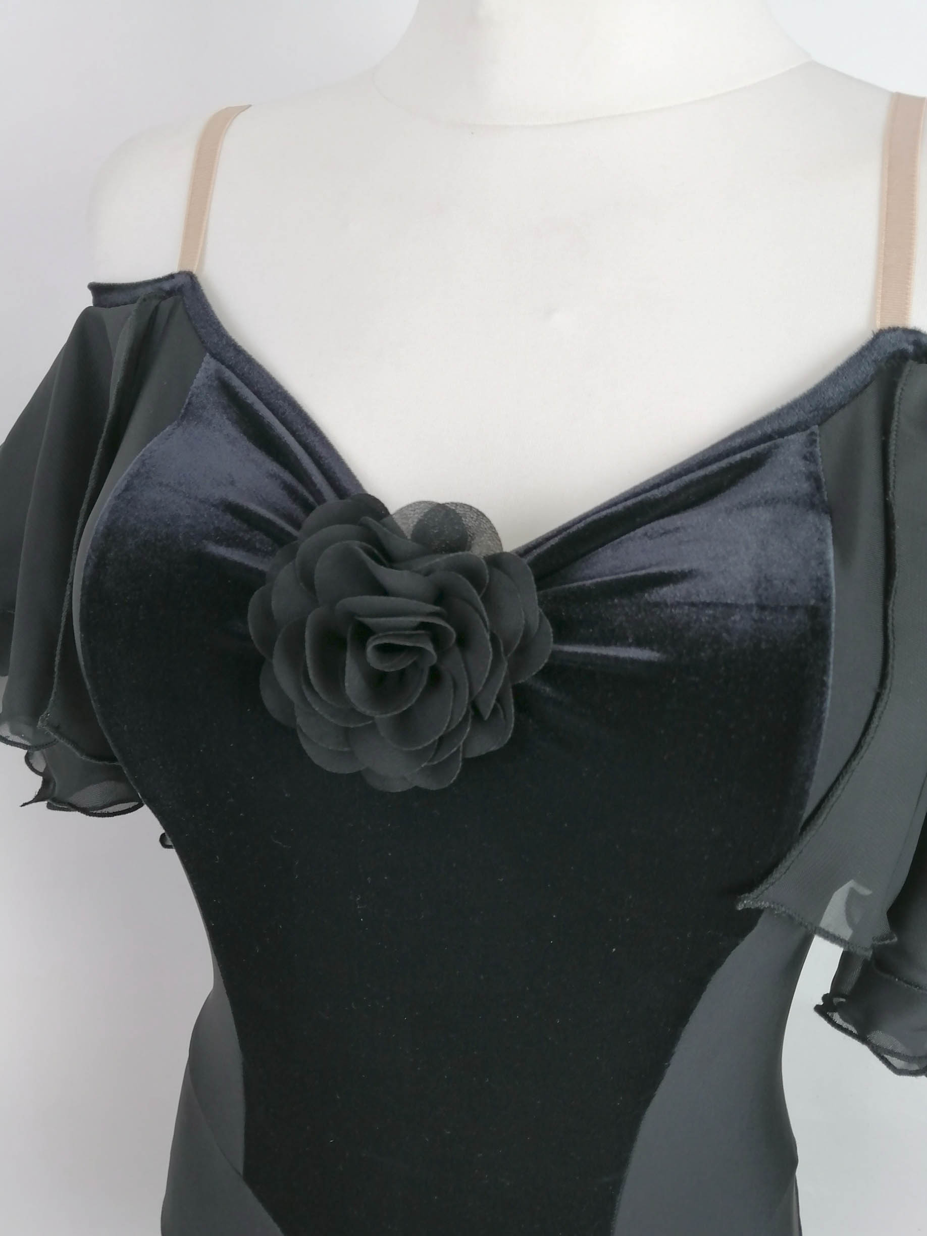 管理人超絶お勧めの超!素晴らしいウクライナのラグジュアリーブランド、「スヴェトラーナ・パブリッシュ」制作のフリルの袖のデザイン、胸元のバラのコサージュ、ベルベットの切り替えが超エレガントで非常にスタイルよく見える黒の長袖のレオタードです。