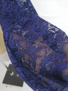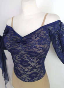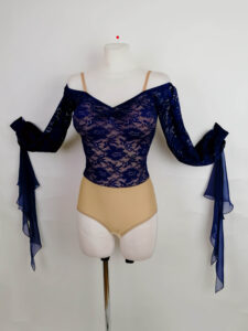 TK-BBF12ウクライナの「スヴェトラーナ・パブリッシュ」制作の」ネイビーの総レースが超エレガントで美しい長袖、オフショルダーのレオタード(未使用新品、一点物、9号)