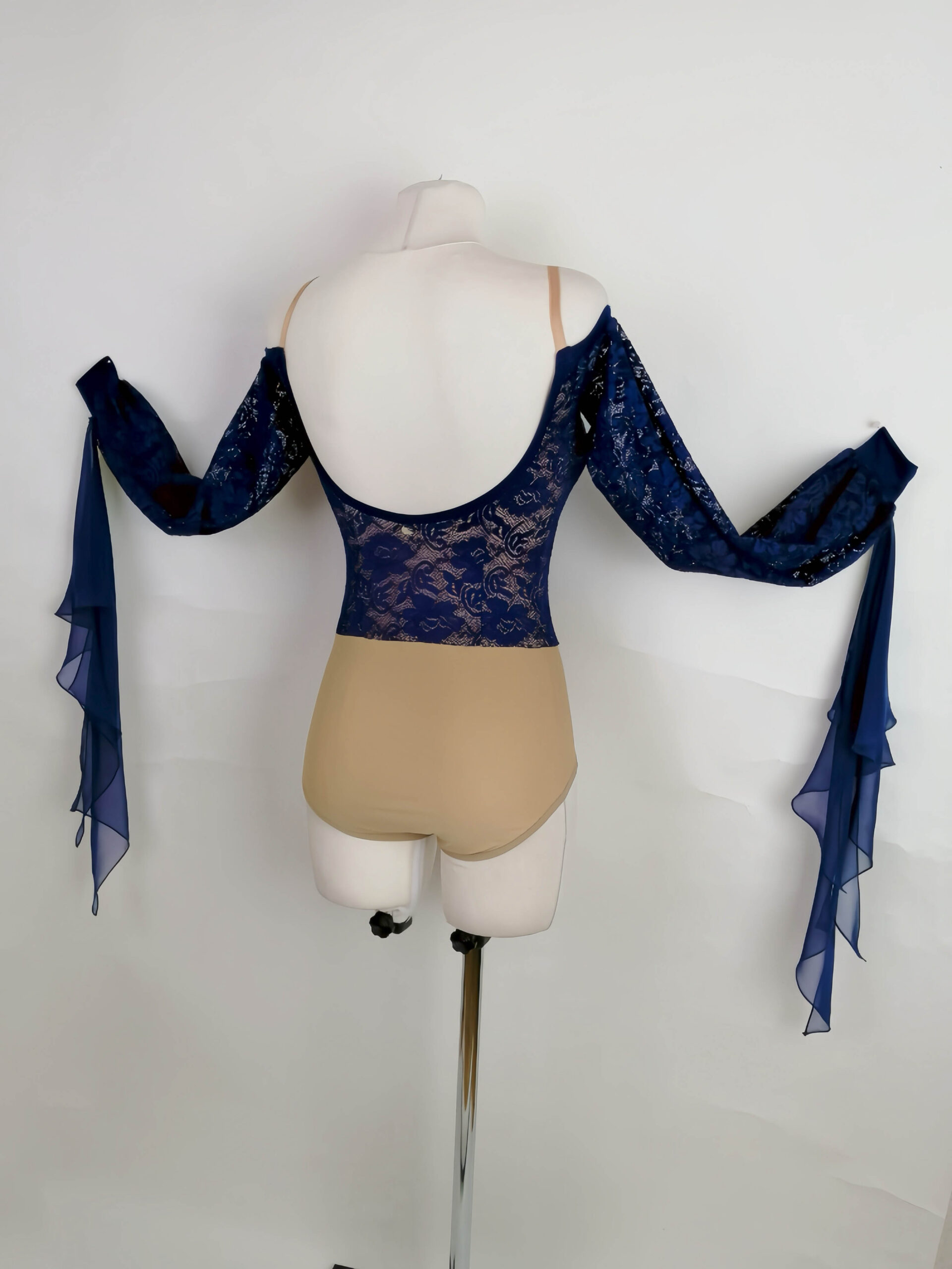 TK-BBF12ウクライナの「スヴェトラーナ・パブリッシュ」制作の」ネイビーの総レースが超エレガントで美しい長袖、オフショルダーのレオタード(未使用新品、一点物、9号)
