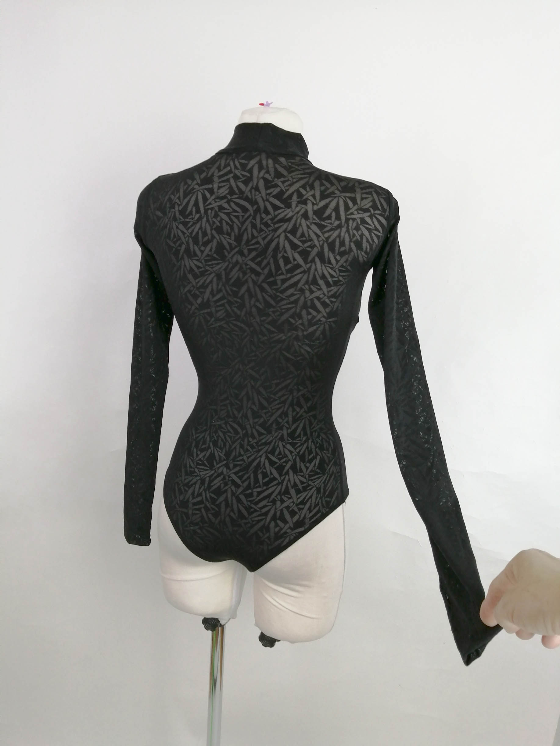 TK-BBF11管理人超お勧め!ルーマニアの「Evoly Design」制作のエレガントなリーフ柄のメッシュが美しいハイネック長袖のスタイリッシュなレオタード(9号(その他のサイズも受注生産OK))