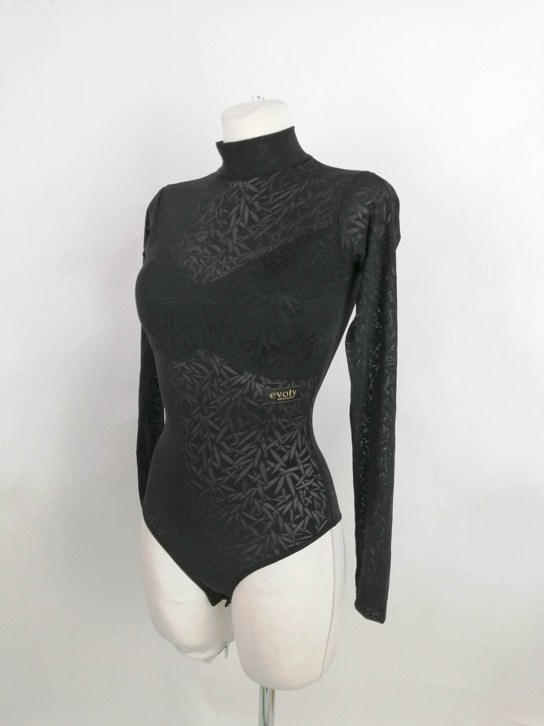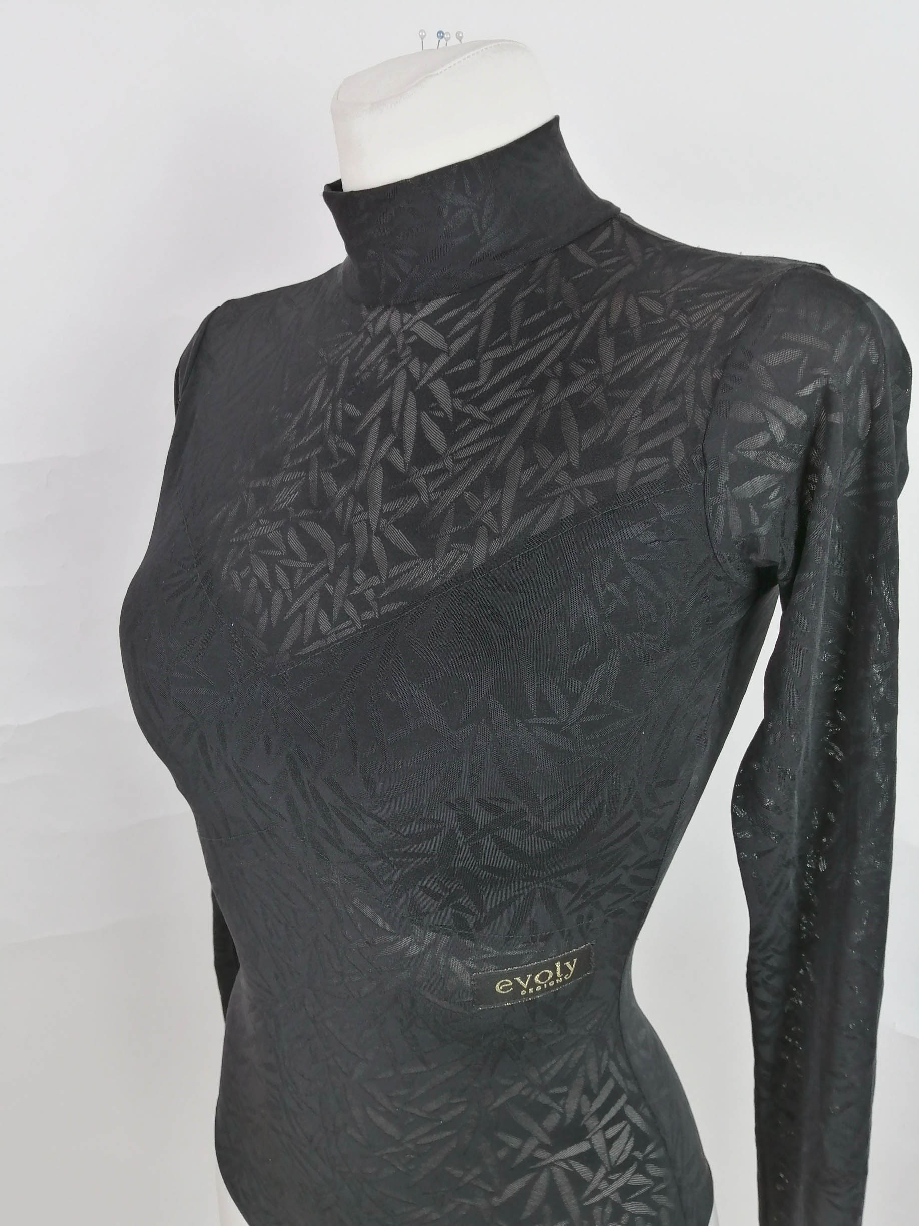 ルーマニアの超素晴らしいダンスウェアブランドで、管理人自身も非常にはまって(笑)多くのウェアをオーダーしている「Evoly Design」のリーフ柄のストレッチメッシュ素材で制作された、ストレッチたっぷりで超スタイリッシュでかっこいいハイネック長袖の黒のレオタードです。