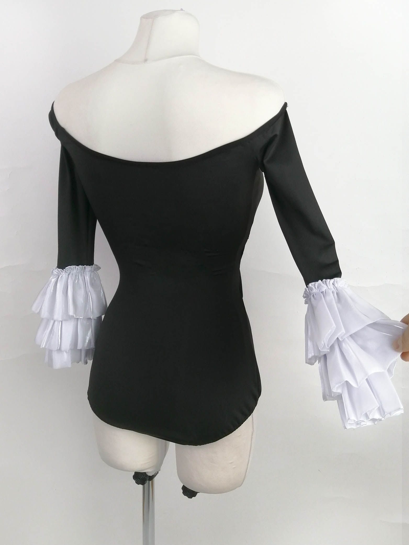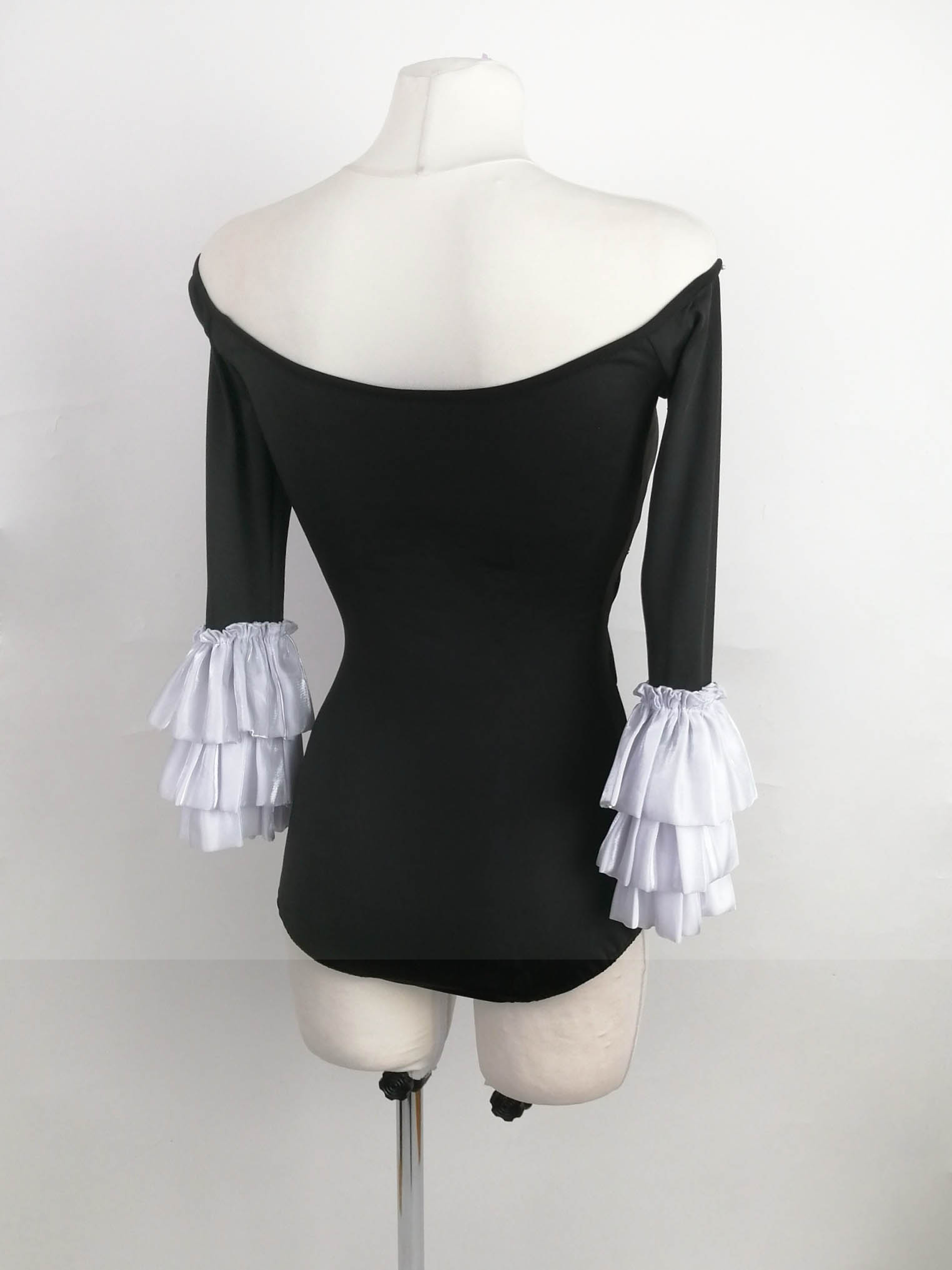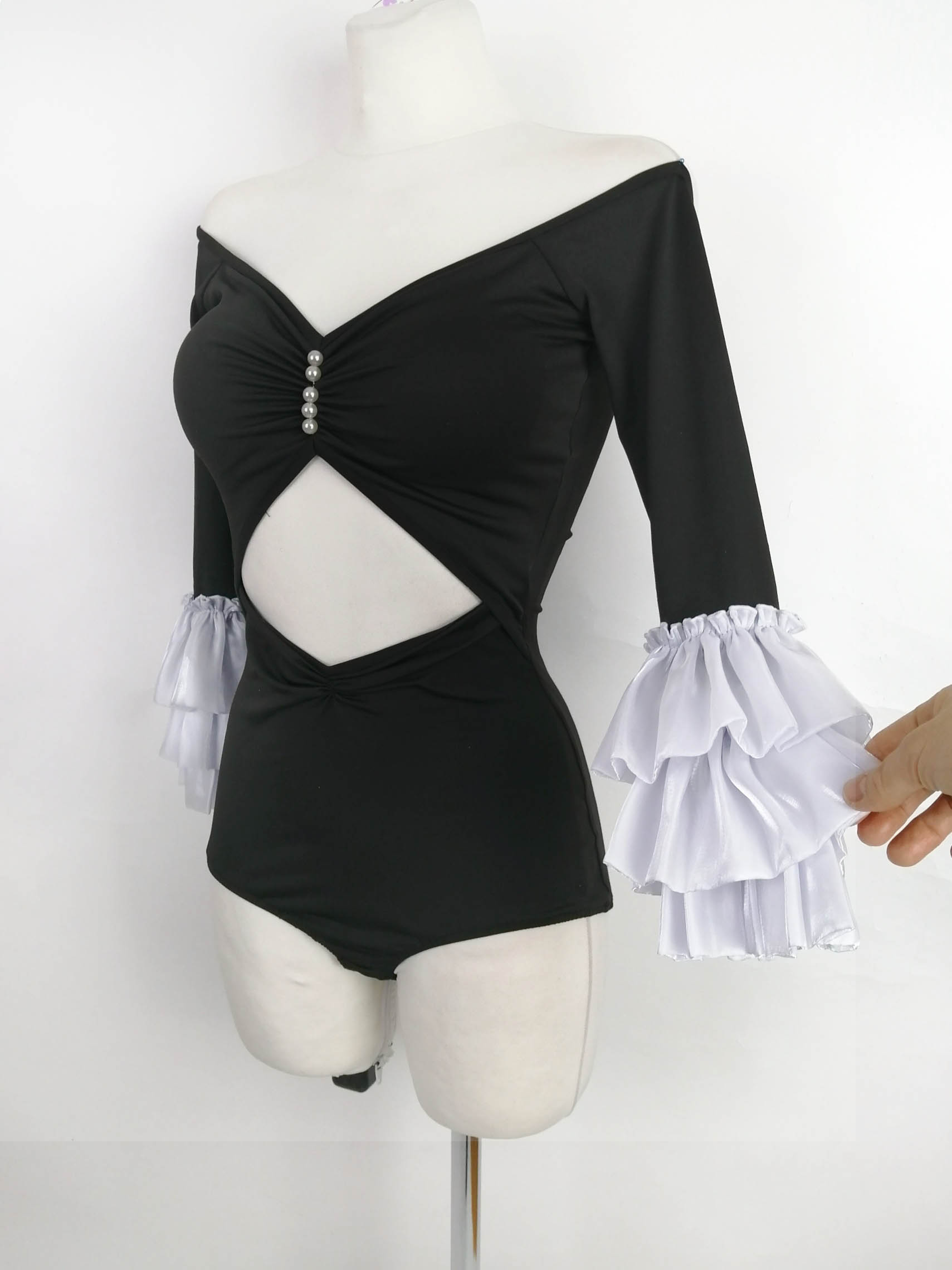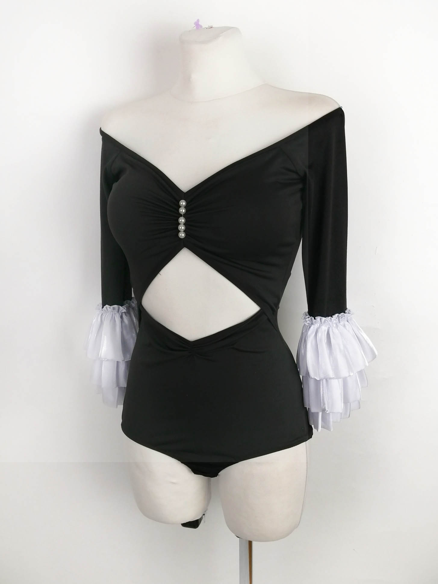 ブラックプールセミファイナリストのタイトルを持つウクライナのトップ選手、マリア・スカッチ選手所有のオフショルダーでパールと白のフリルの袖のデザインが大変美しい黒のレオタードです。