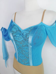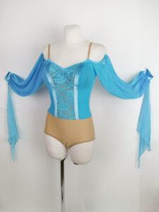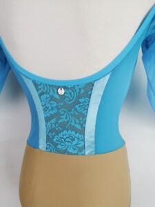 管理人超絶お勧めの超!素晴らしいウクライナのラグジュアリーブランド、「スヴェトラーナ・パブリッシュ」制作のエレガントで美しく豪華な一点物のターコイズブルーの長袖のレオタードです。クリスアンクローバーのストレッチメッシュ素材、ストレッチレース素材、ストレッチベルベット素材とジョーゼットを使って制作されており、ボディ部分は両サイドがダブルメッシュ、ベルベットの縦のラインを入れて、中央に美しいクリスアンクローバーのストレッチレースの素材を使って切り替えているので大変スタイルよく見せる視覚効果のあるデザイン。特に光沢のあるベルベットのラインが絶妙で、ウェストが細く超スタイルよく見えるデザインです。レースの下にはベージュのストレッチメッシュを重ねているのでレースの柄がはっきりと浮き上がり、かつ透けることがなくて安心して着用することができます。