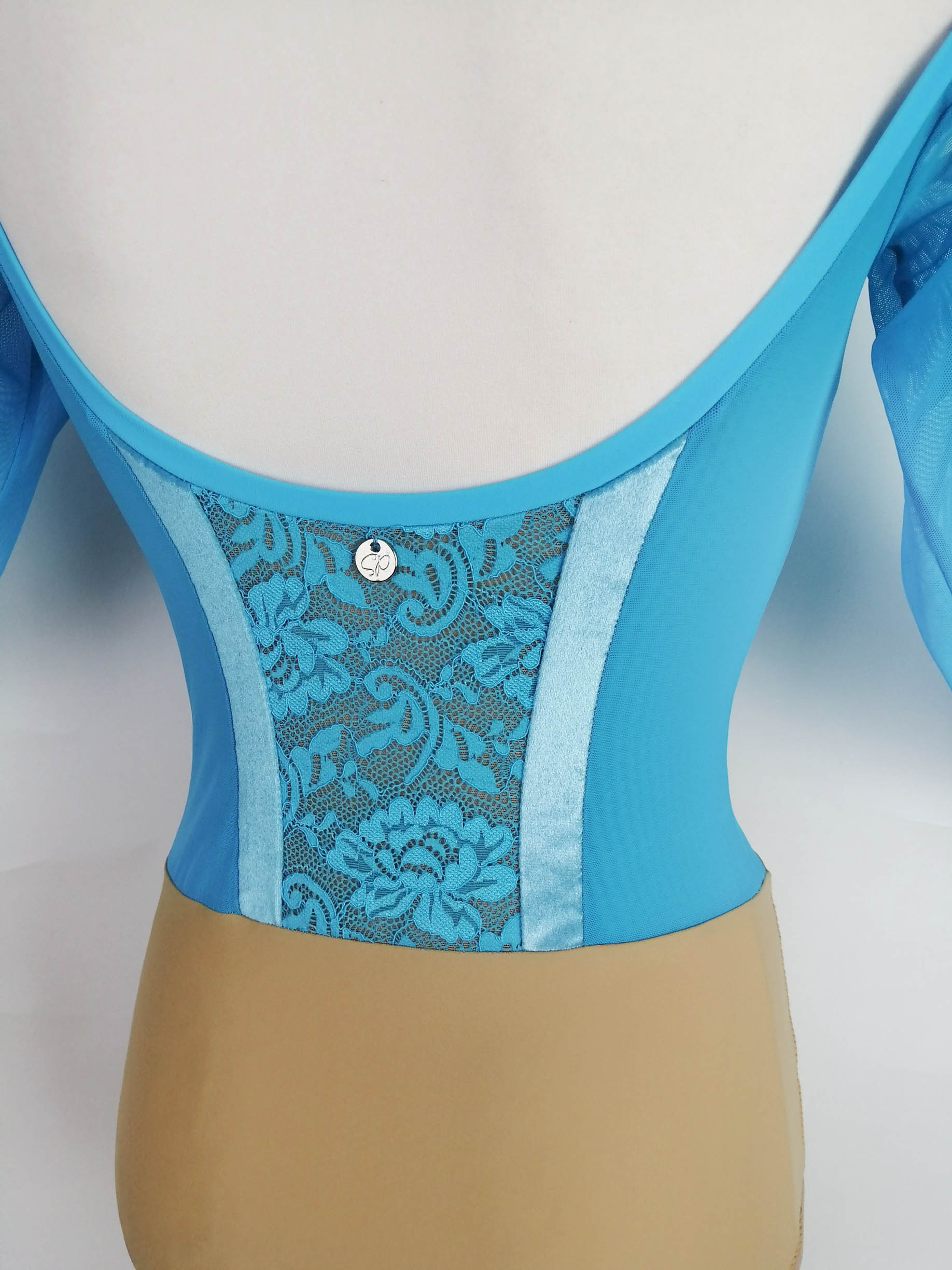 管理人超絶お勧めの超!素晴らしいウクライナのラグジュアリーブランド、「スヴェトラーナ・パブリッシュ」制作のエレガントで美しく豪華な一点物のターコイズブルーの長袖のレオタードです。クリスアンクローバーのストレッチメッシュ素材、ストレッチレース素材、ストレッチベルベット素材とジョーゼットを使って制作されており、ボディ部分は両サイドがダブルメッシュ、ベルベットの縦のラインを入れて、中央に美しいクリスアンクローバーのストレッチレースの素材を使って切り替えているので大変スタイルよく見せる視覚効果のあるデザイン。特に光沢のあるベルベットのラインが絶妙で、ウェストが細く超スタイルよく見えるデザインです。レースの下にはベージュのストレッチメッシュを重ねているのでレースの柄がはっきりと浮き上がり、かつ透けることがなくて安心して着用することができます。