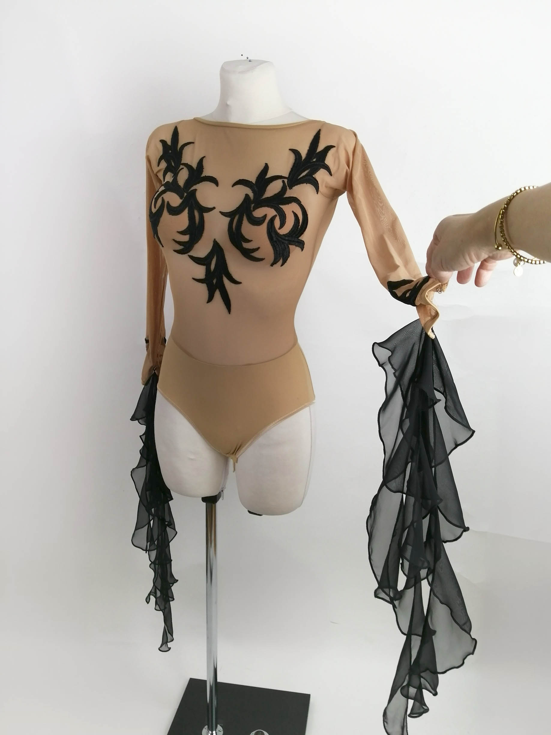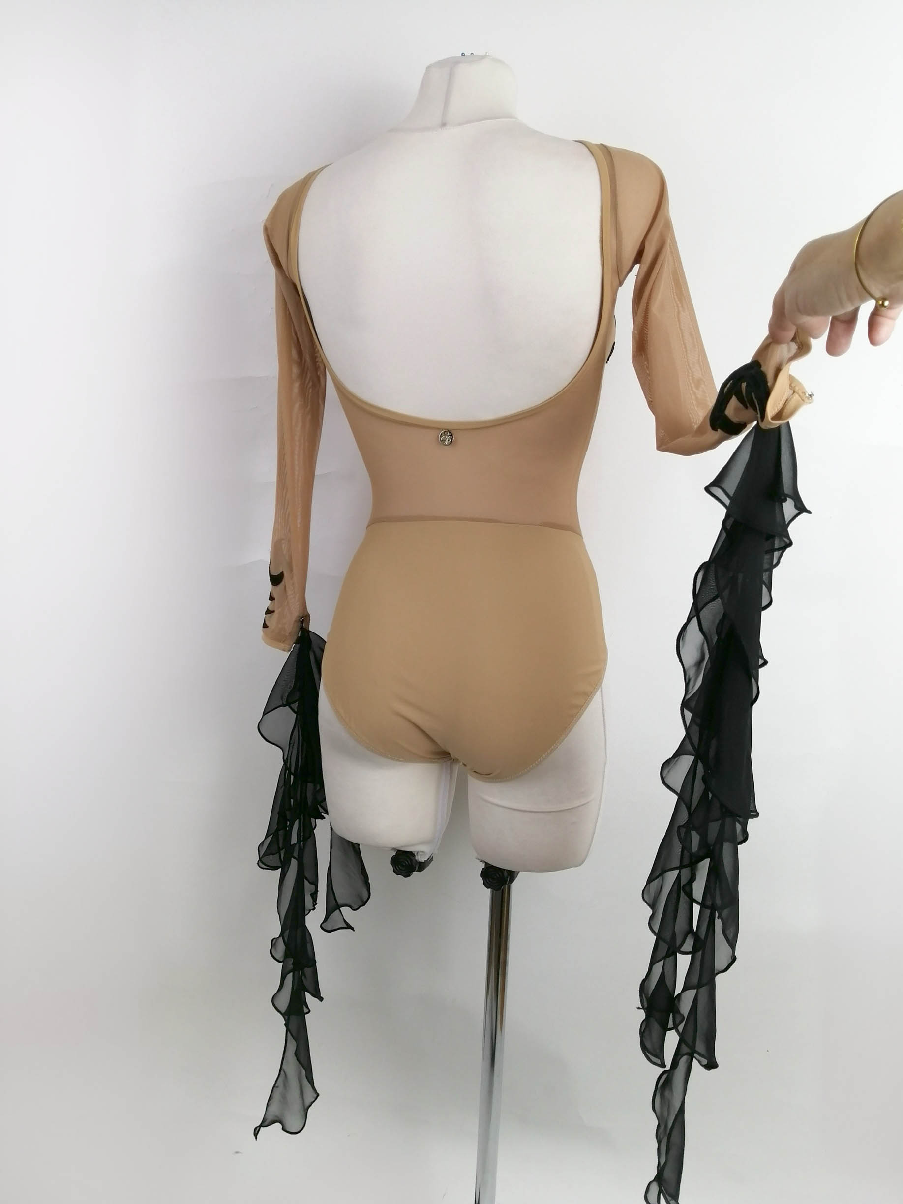 TK-DBF3ブラックプールセミファイナリスト所有の、スヴェトラーナ・パブリッシュ制作の一点物のベージュ&黒のレースのレオタード(9号)